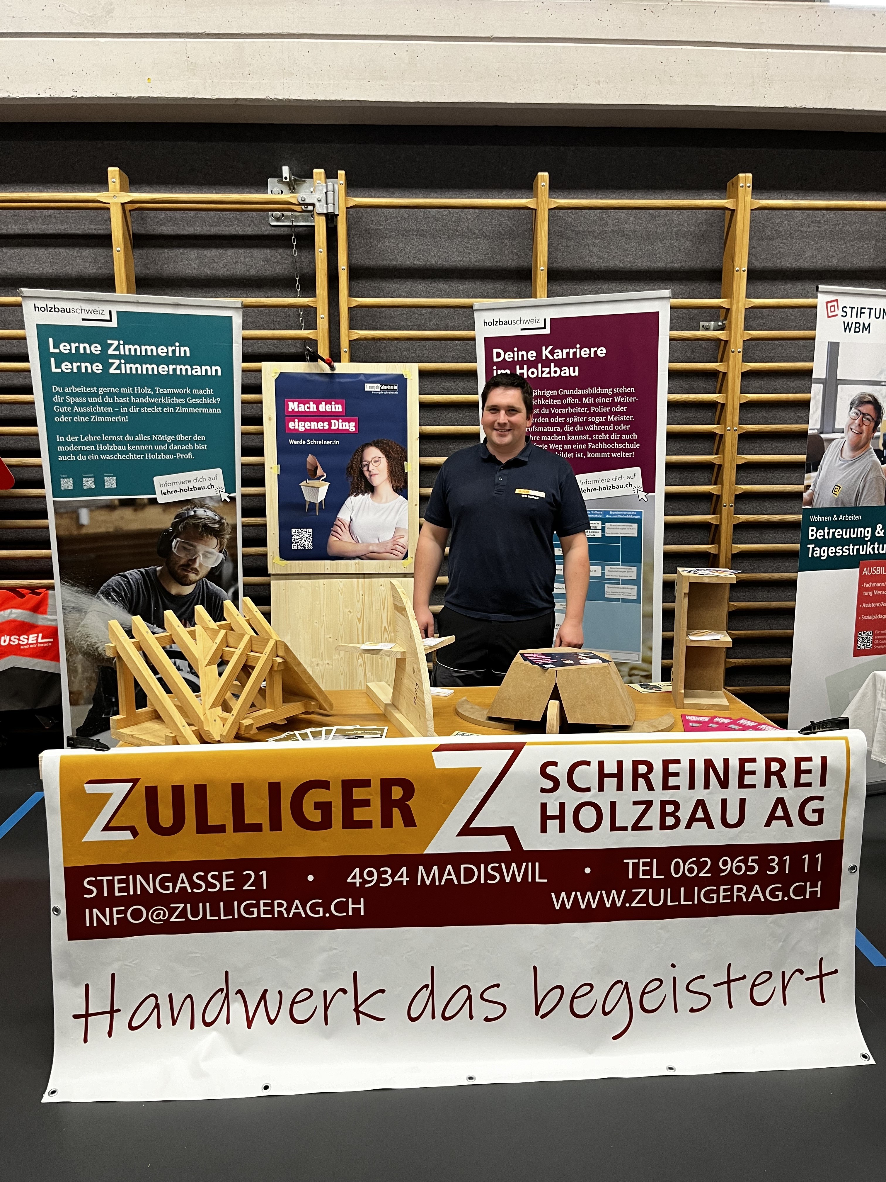 Unsere Firma wurde von Lukas Bohner vertreten, welcher die jungen Leute mit spannenden Gesprächen über unseren Betrieb und die beiden Berufe Zimmermann und Schreiner informierte. 😎