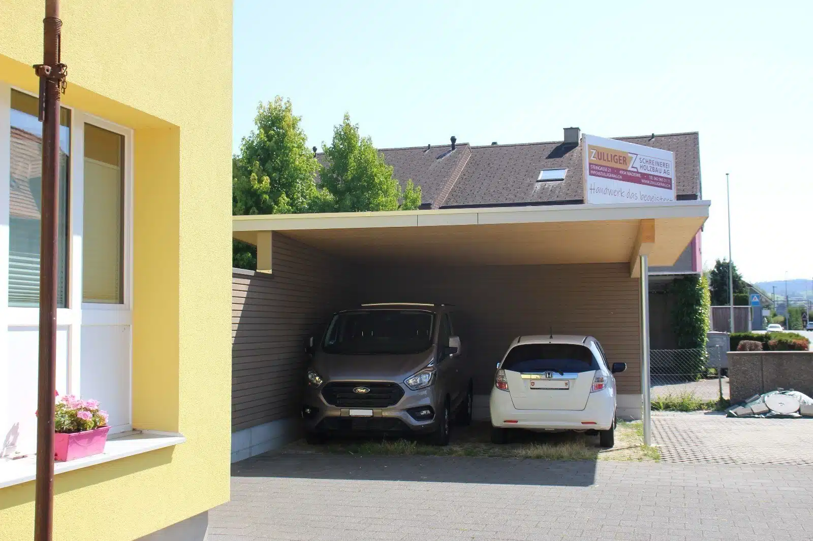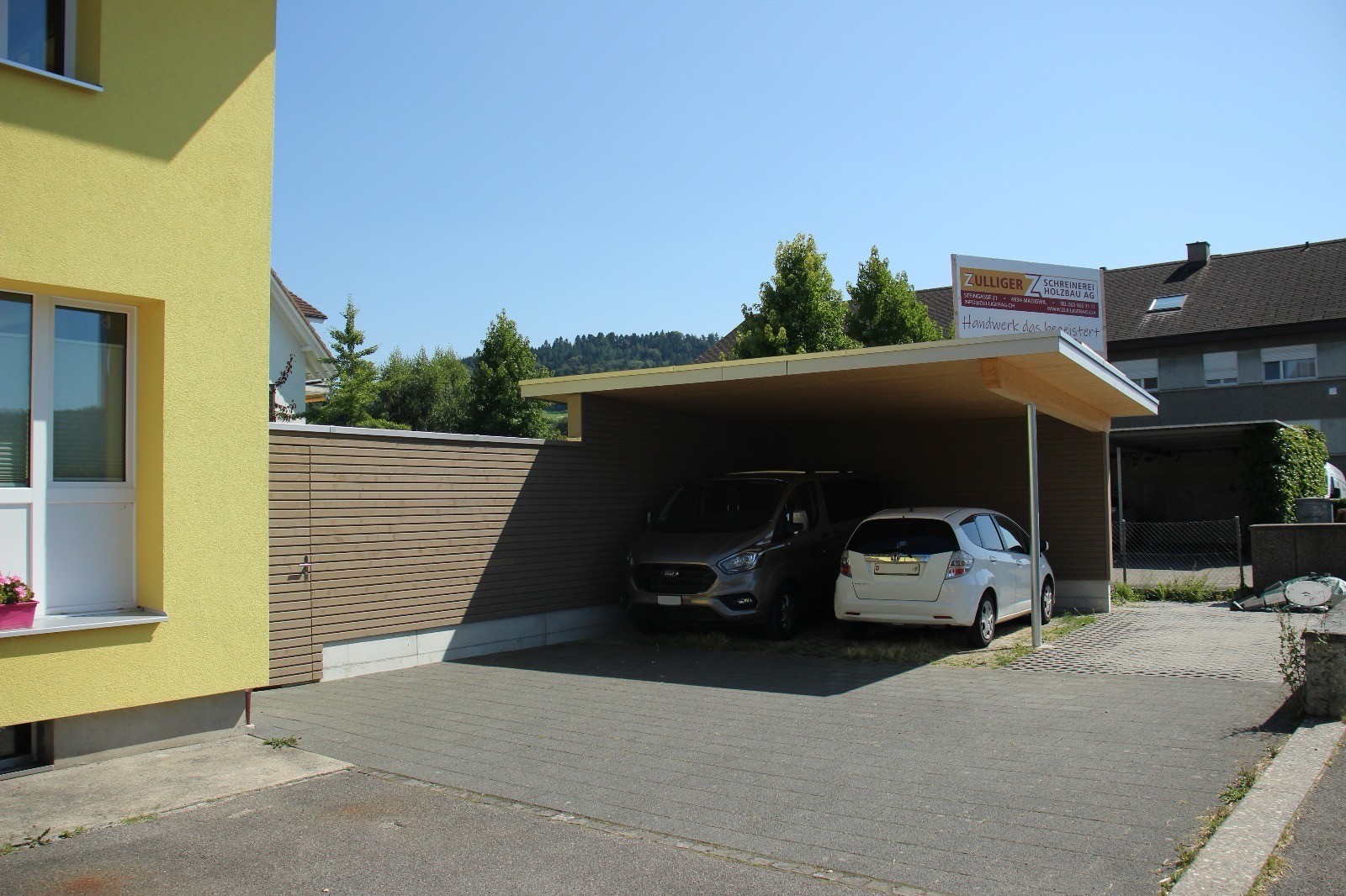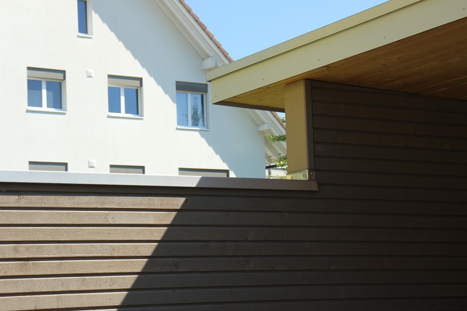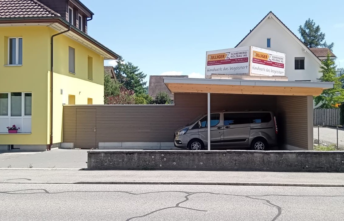 Carport mit einer Sichtschutzwand aus vorvergrauter Rhomboidschalung.🚗🚐