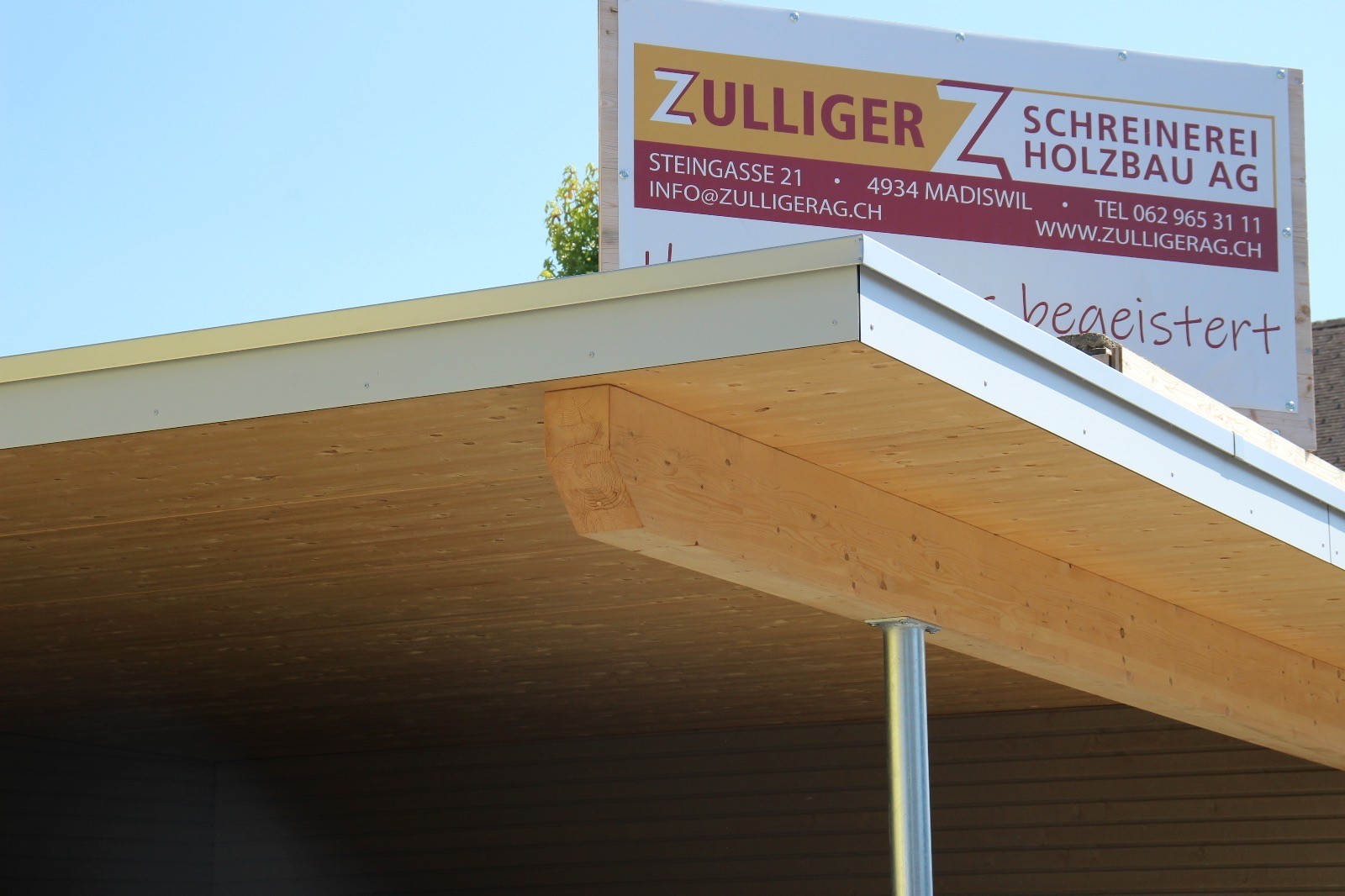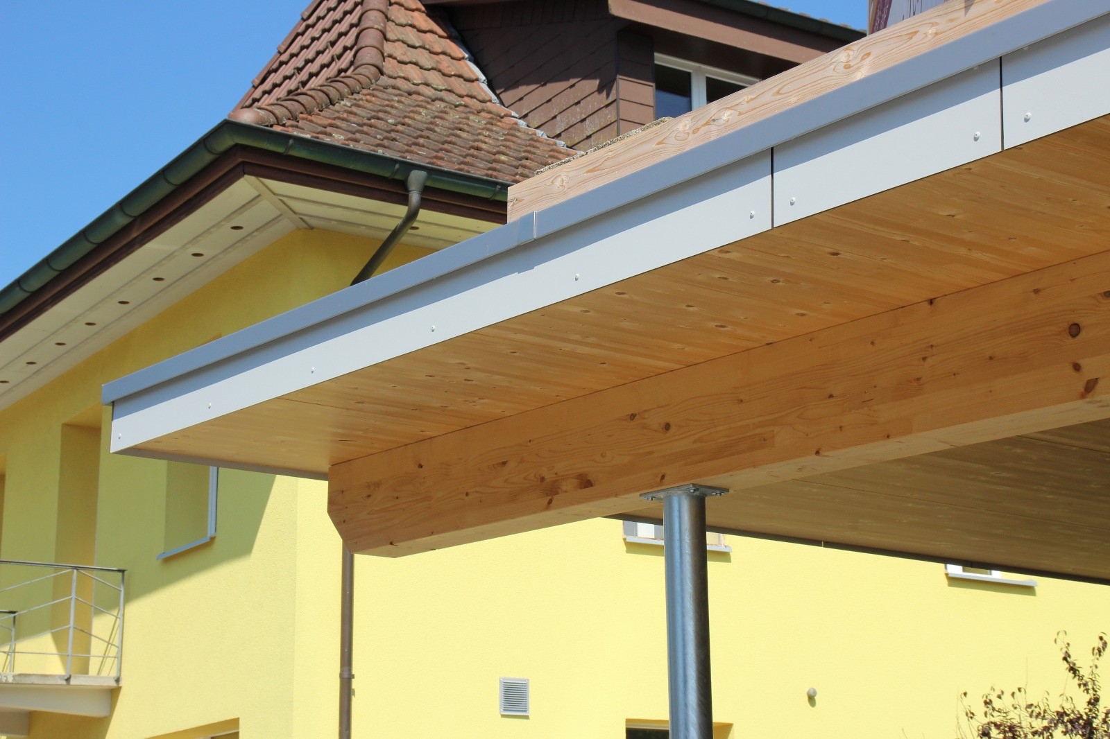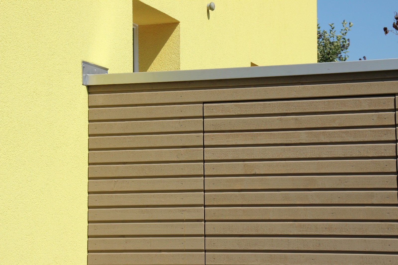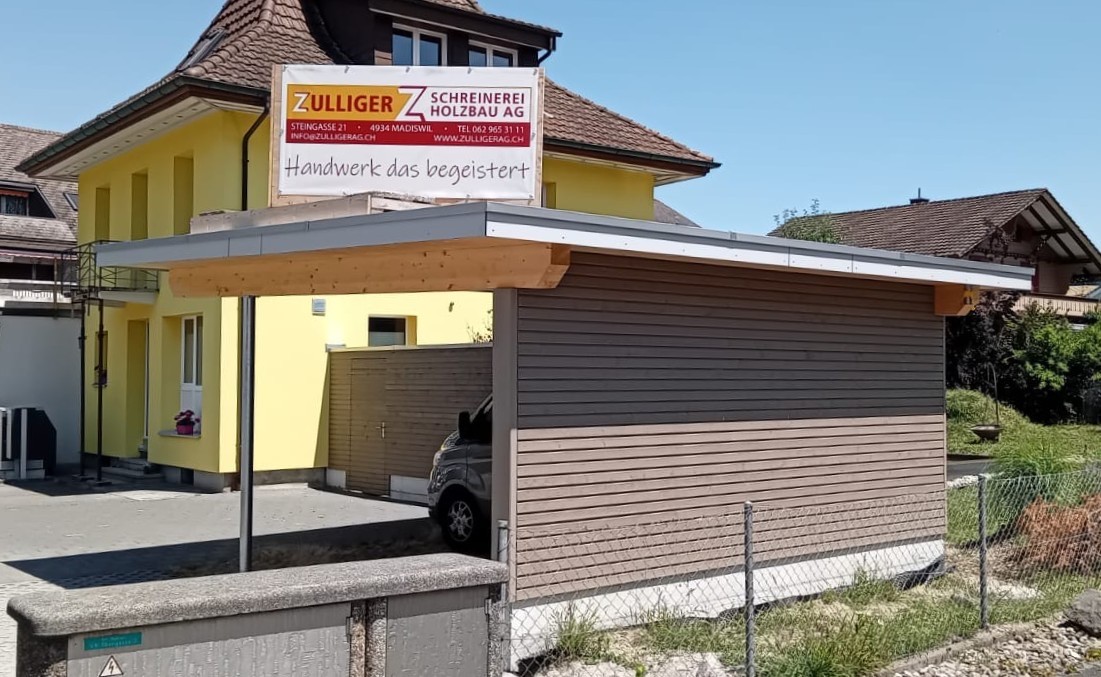 Carport mit einer Sichtschutzwand aus vorvergrauter Rhomboidschalung.🚗🚐