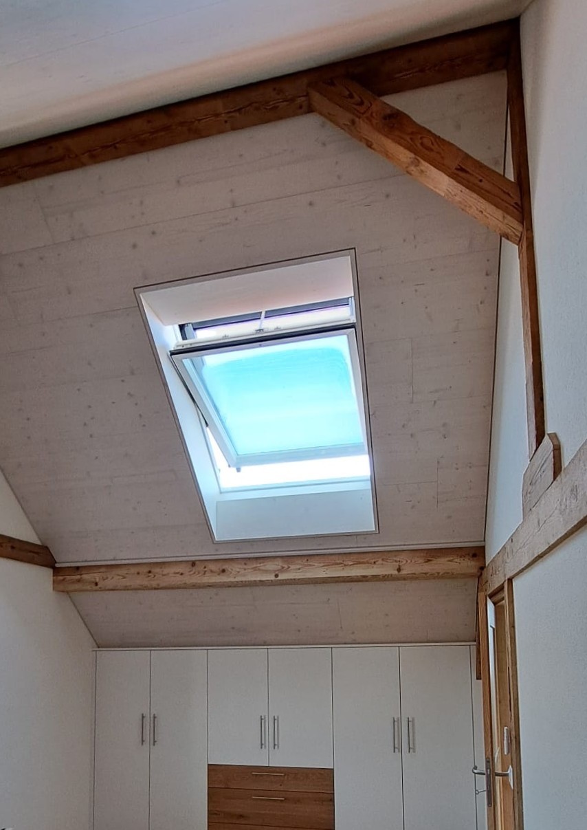Im Innenbereich durften wir die Sichtbalken neu bürsten, das Täfer anbringen und auch die neuen Dachfenster einbauen. 💪🏻😎