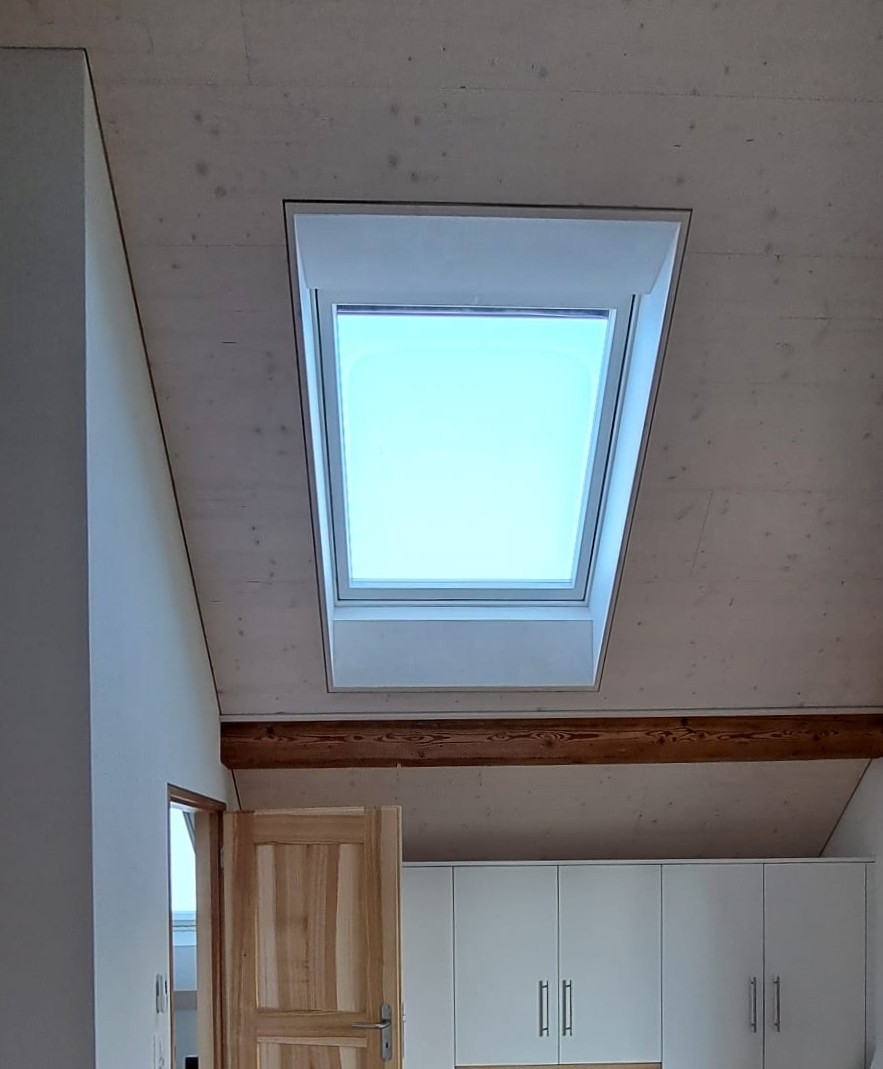 Bei diesem Wohnhaus wurde eine energetische Dachsanierung gemacht. Das Dach wurde neu isoliert, wodurch ein dickes unter Dach entsteht. Zusätzlich wurden auf der einen Dachhälfte Solarpanels montiert. 🏠