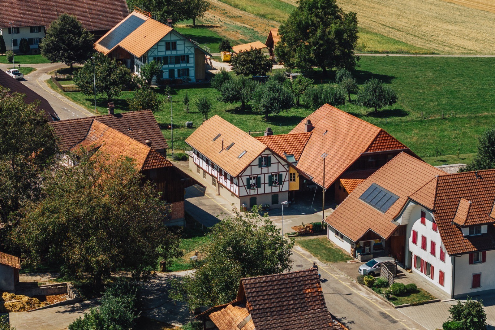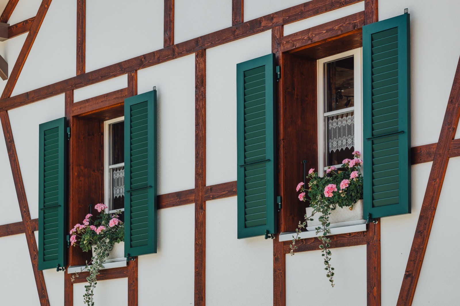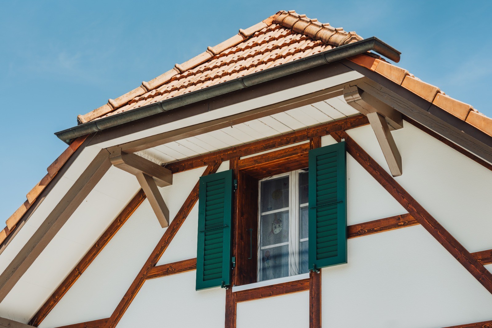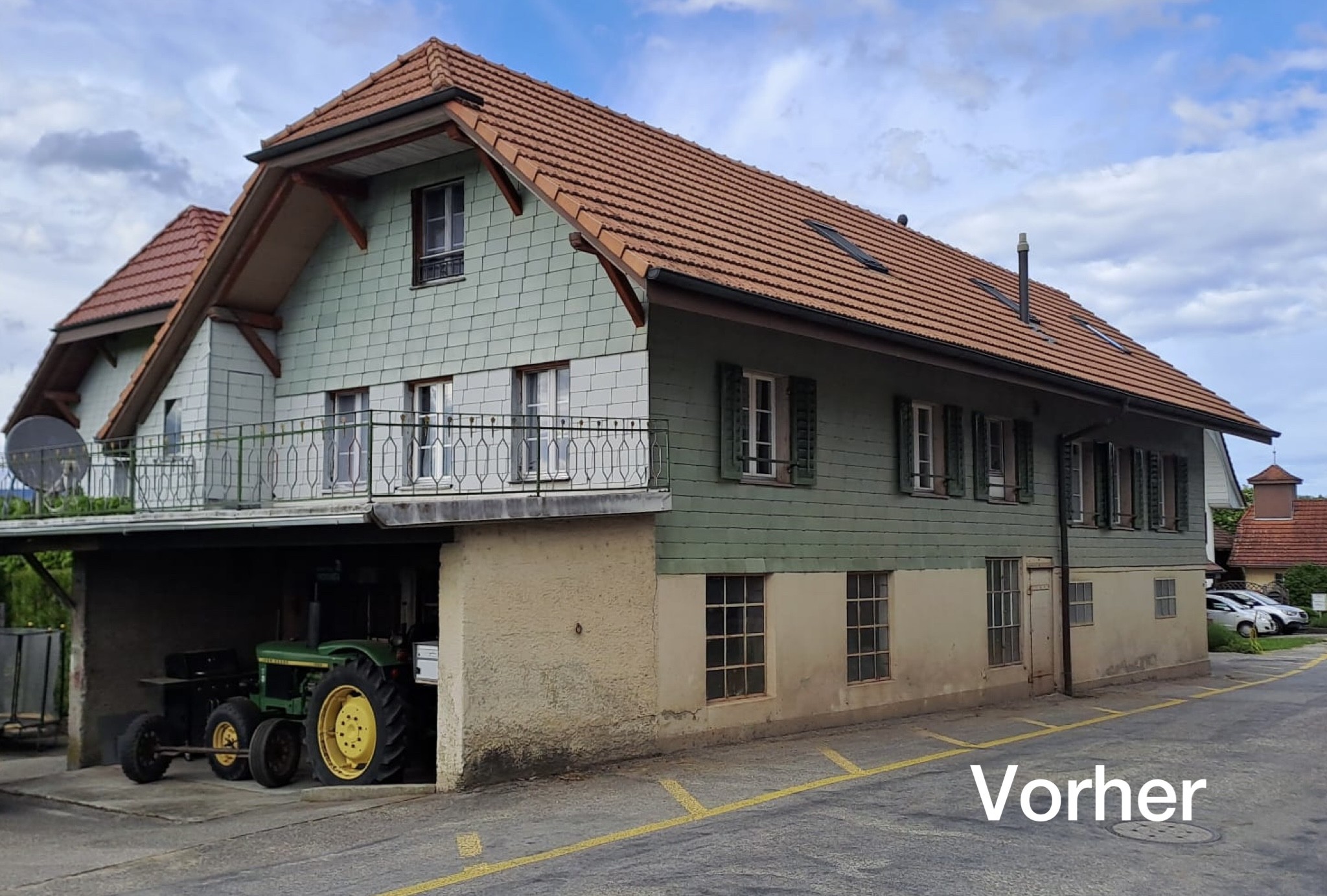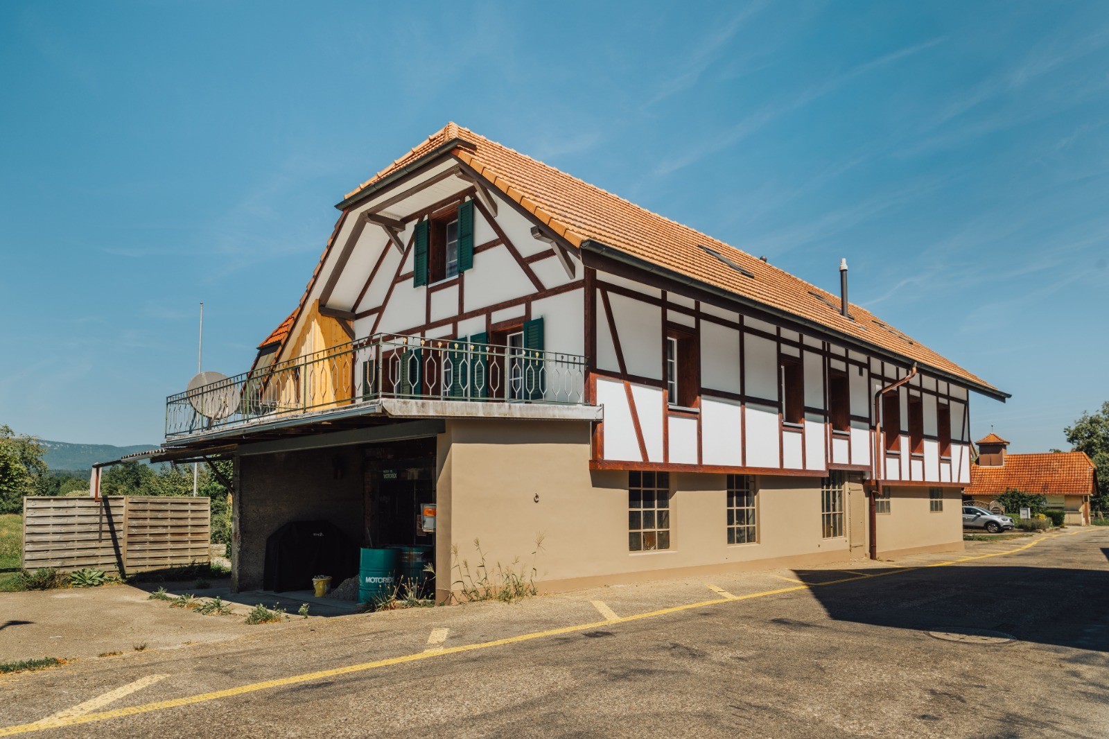 Bei diesem alten Gebäude wurde eine Fassadensanierung gemacht. Durch das neue Blindriegwerk erstrahlt es wieder in altem Glanz.🏠✨Beim hinteren Hausteil wurde die Fassade mit vorvergrauter Schalung verkleidet.