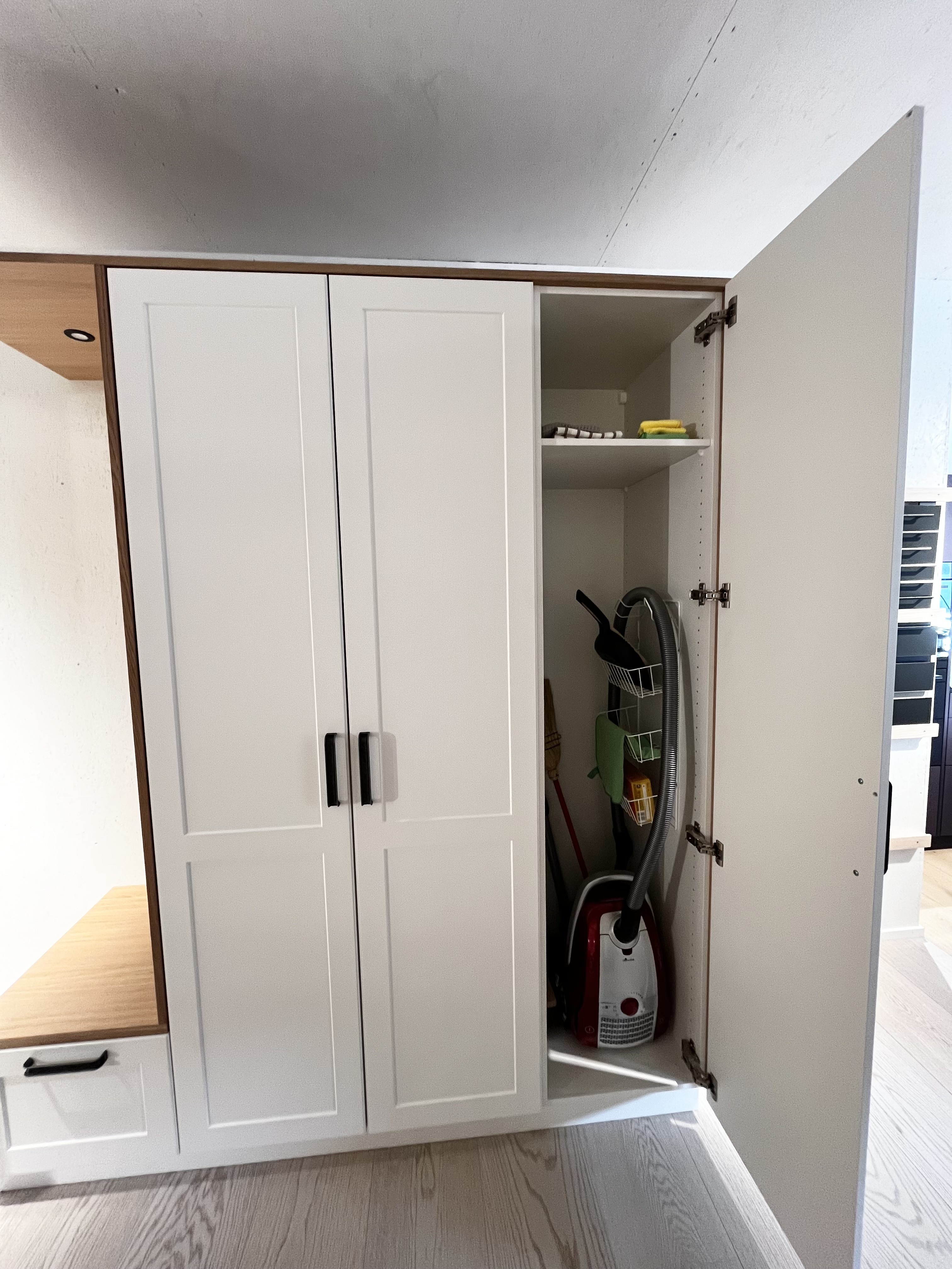 Putzschrank: Besenhalter mit vier Griffen, drei Aufbewahrungskörbe mit Staubsaugerschlauchhalterung