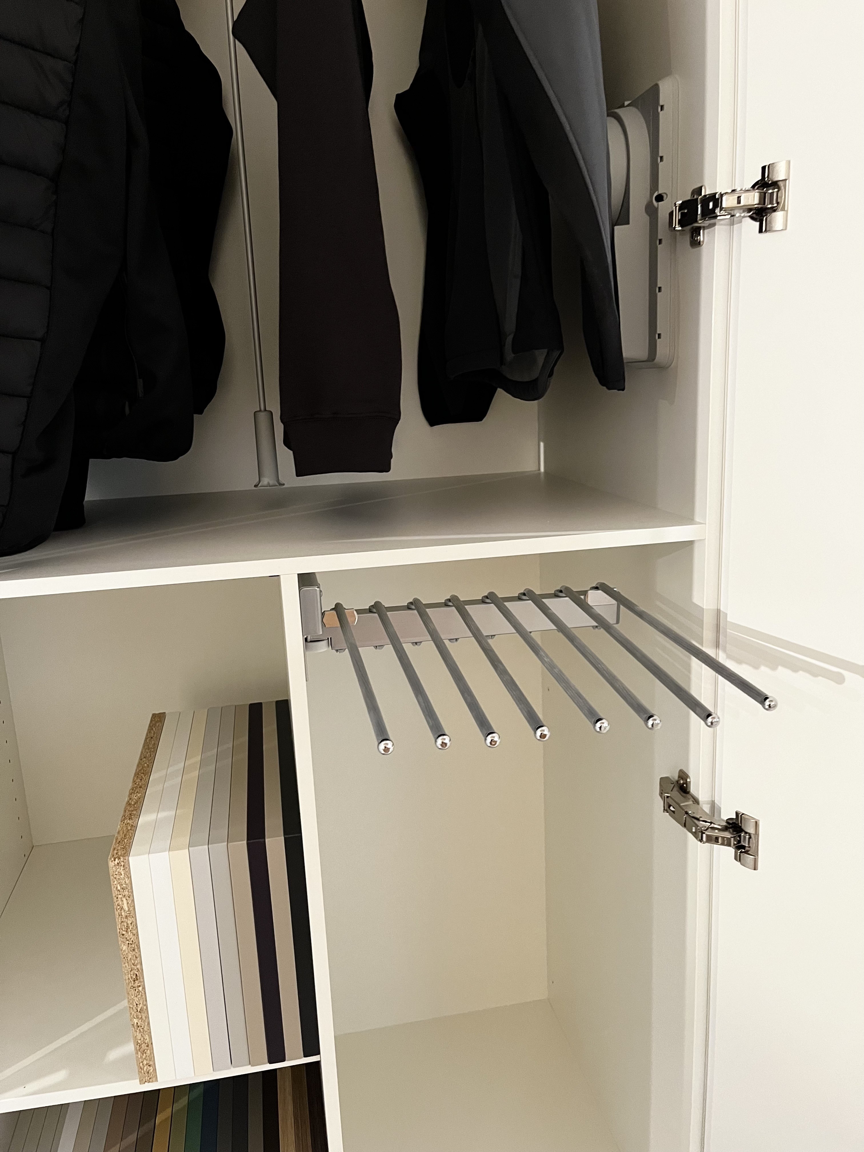 Im Inneren des Schrankes befindet sich zum einen ein Hosen Auszug und zum anderen ein Kleiderlift. Beides lässt sich heraus oder runterziehen und erleichtert das Verstauen der Kleidung.