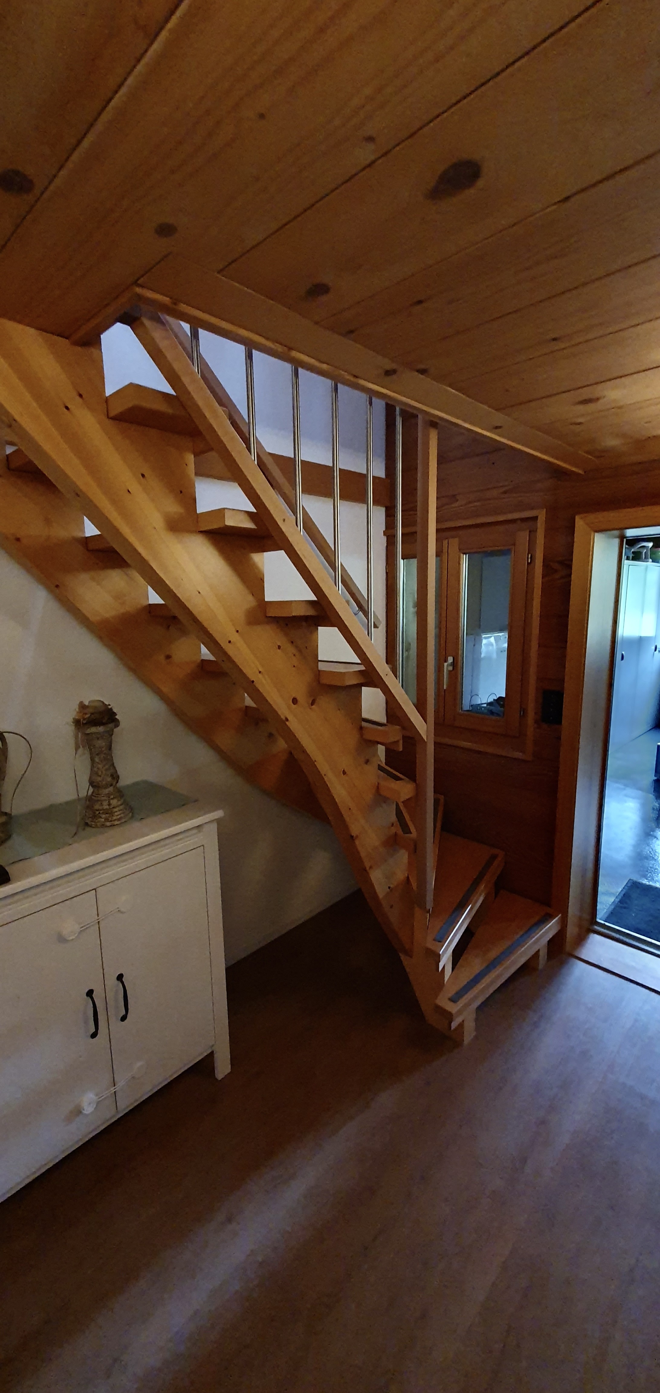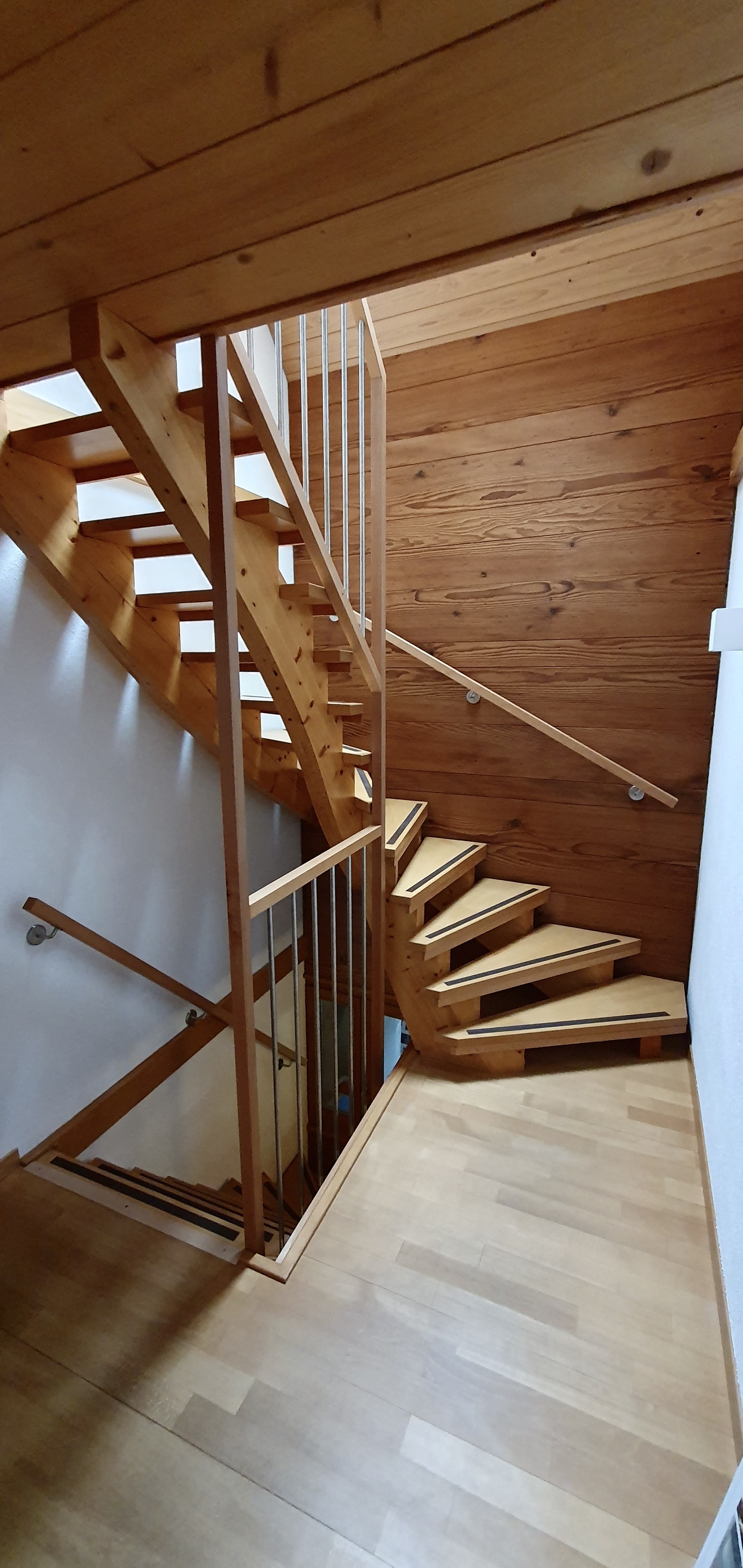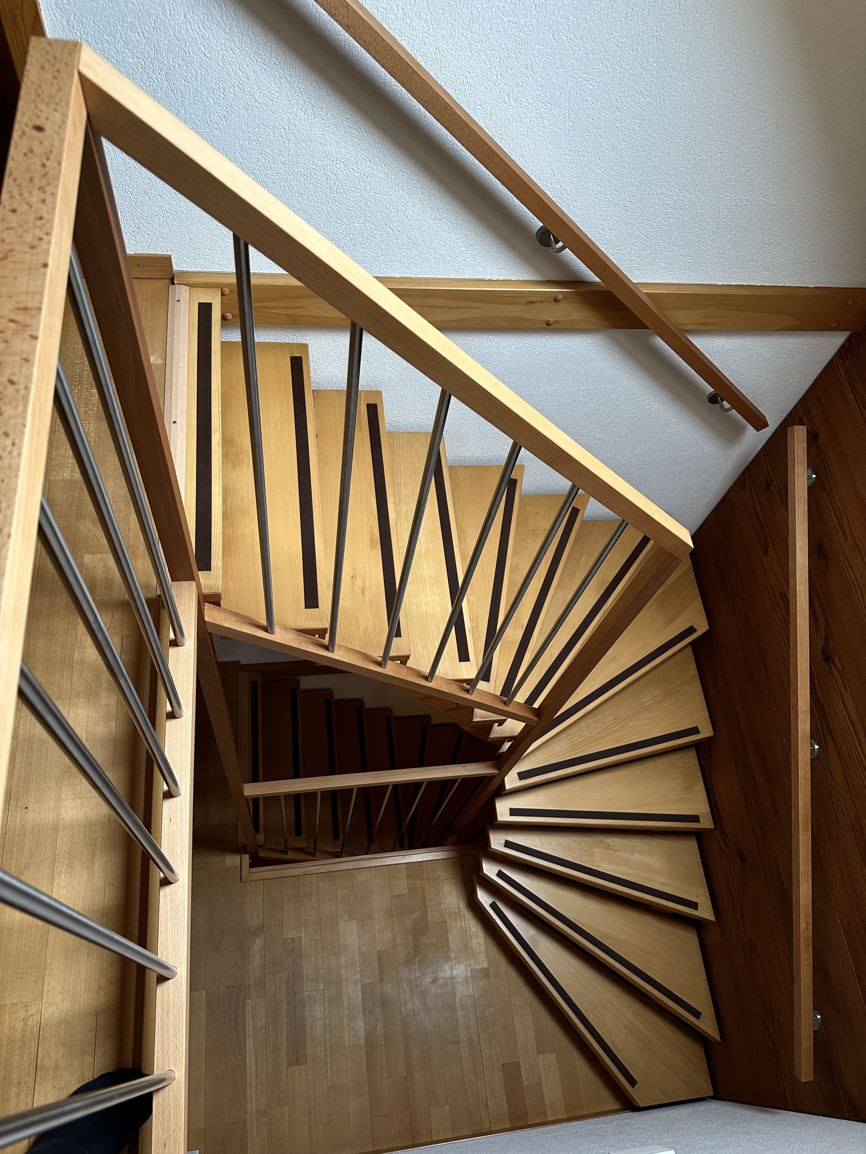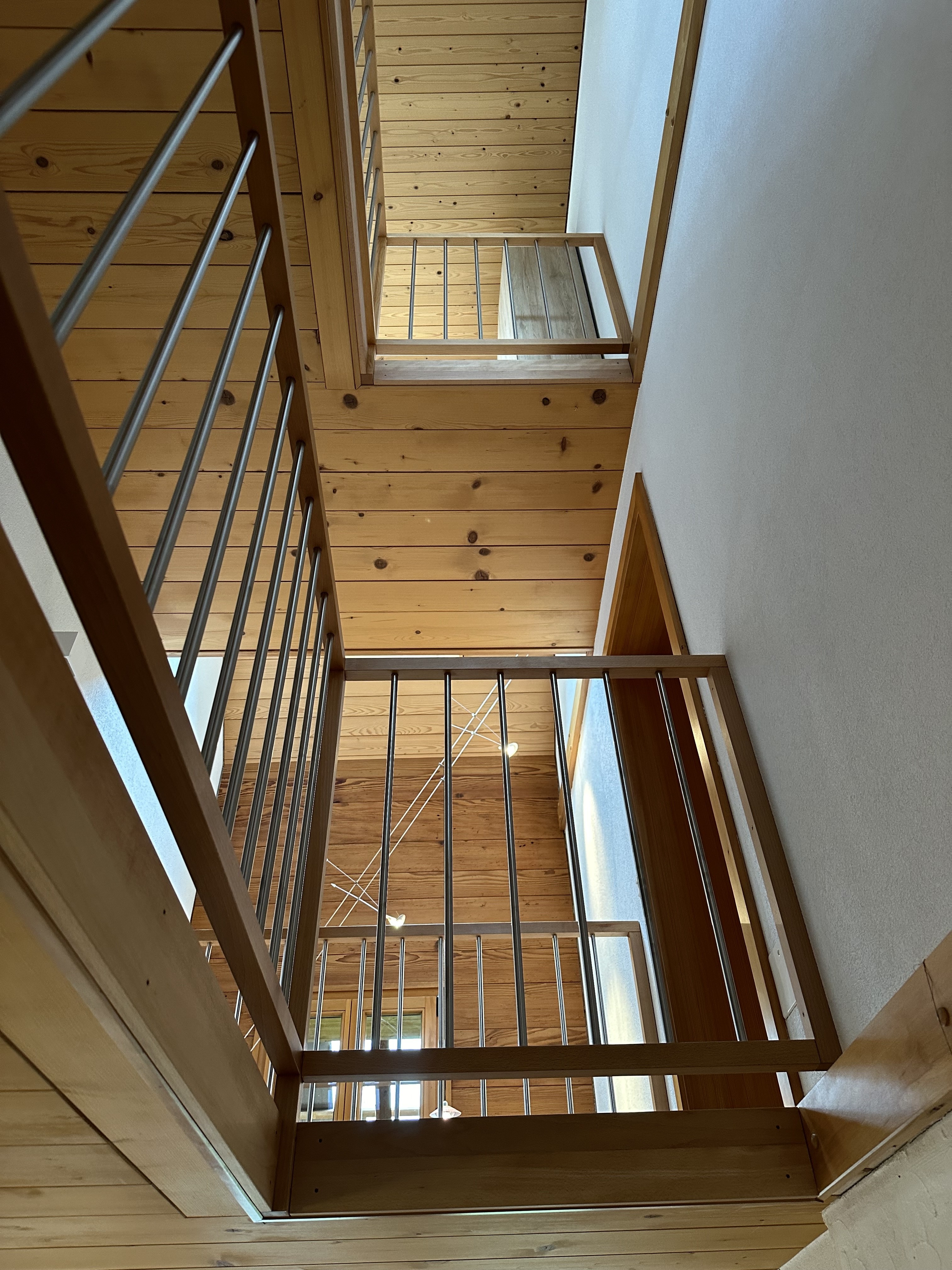 Die einzelnen Geländerteile wurden in der Werkstatt verleimt und dann vor Ort fertig zusammengebaut und montiert. Speziell ist sicher das Treppengeländer, welches gleich über drei Stockwerke geht. 😎