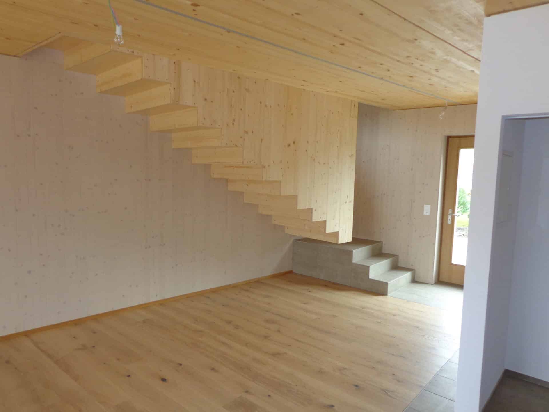 In Zusammenarbeit mit Architekt und Bauherrschaft führen wir die gesamte Holzbauplanung, Fertigung und Montage der Elementhäuser aus. A