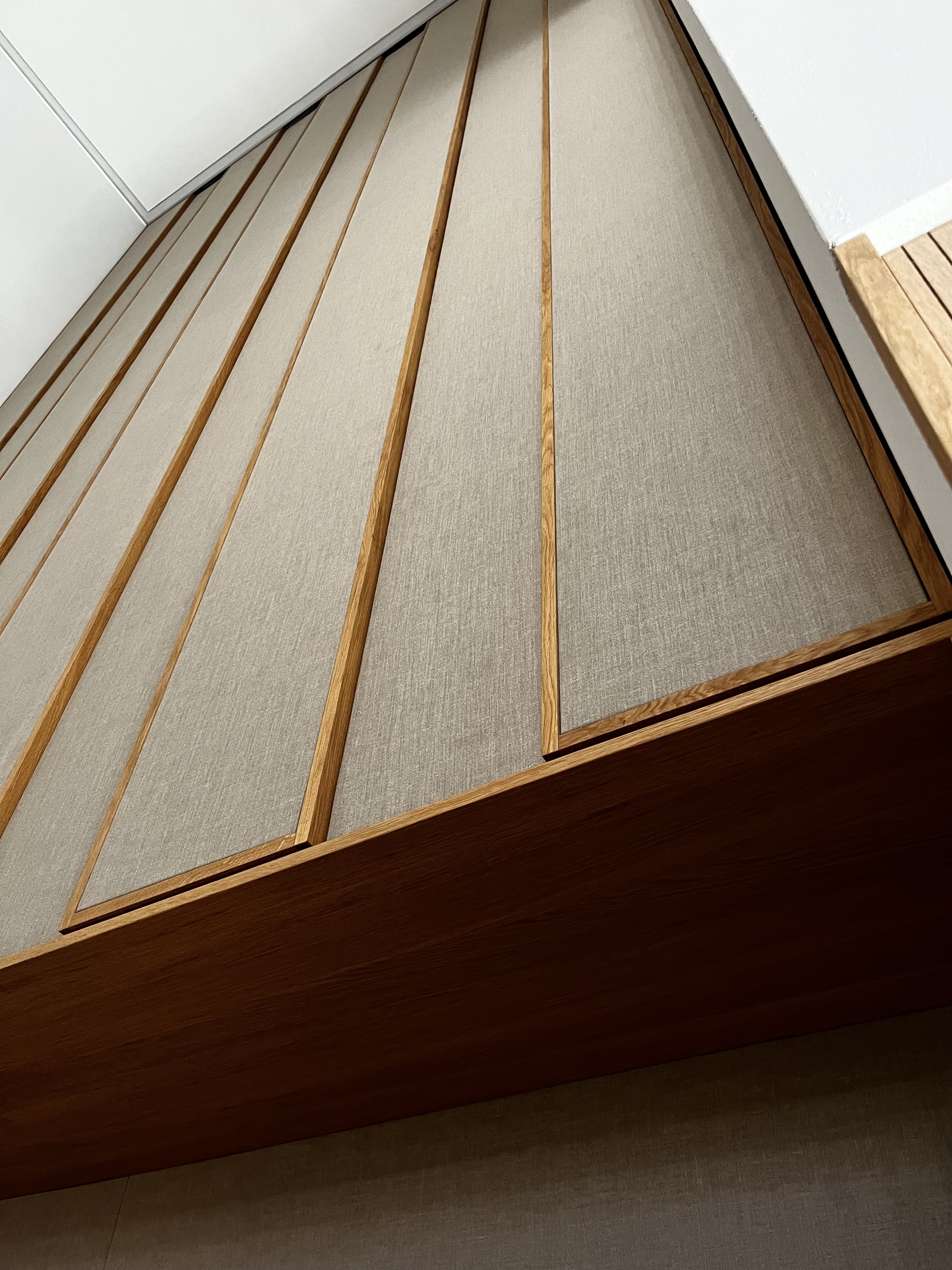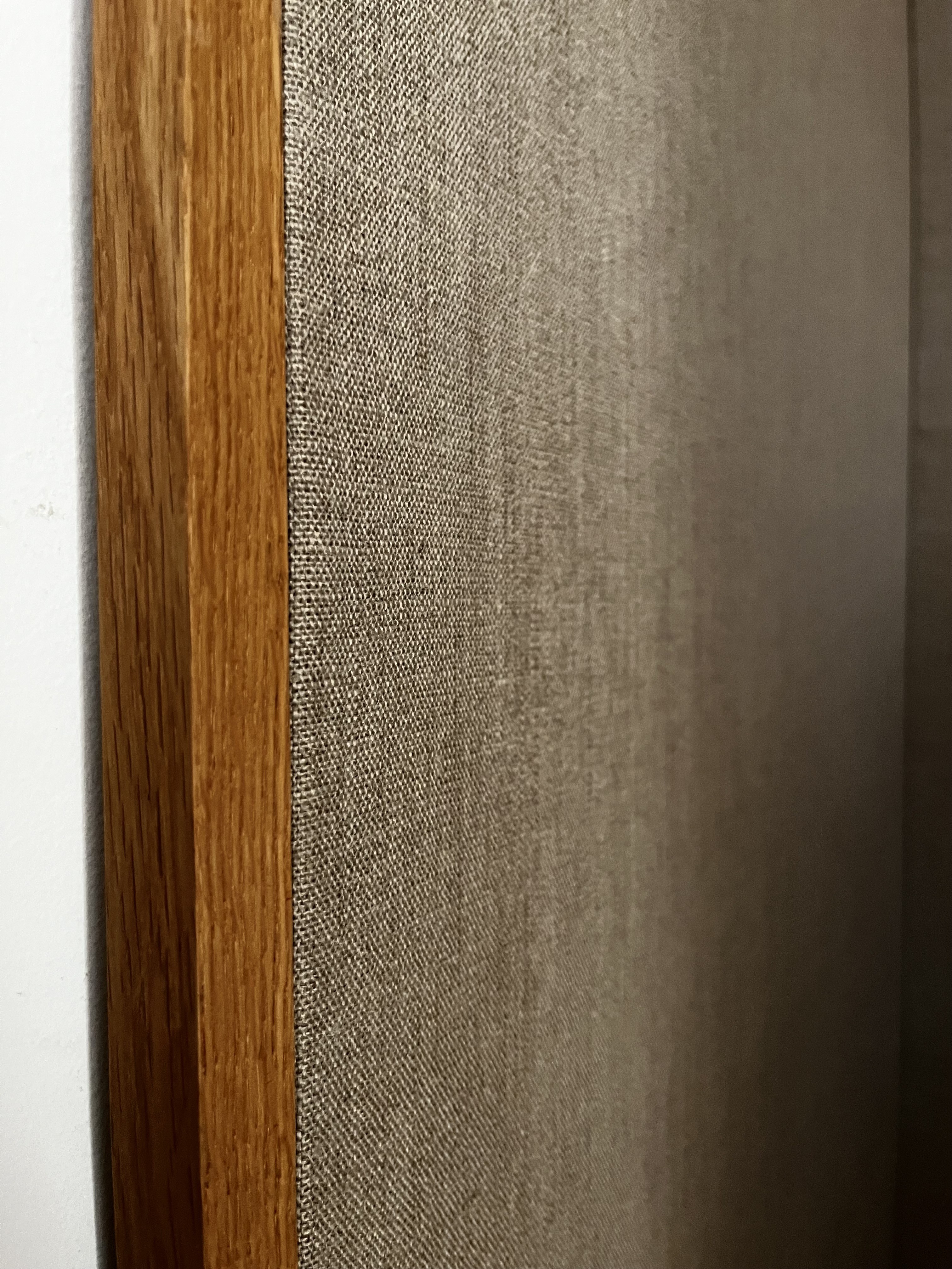 Zwischen die Massivholzrahmen aus Eiche, wurde ein Stoff mit speziellem Akustikgewebe gespannt. So werden zwar die Lautsprecherboxen verdeckt, verlieren aber nicht an Tonqualität.