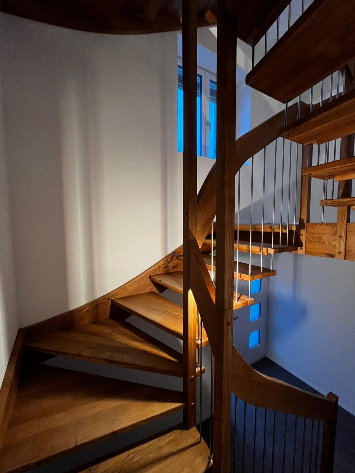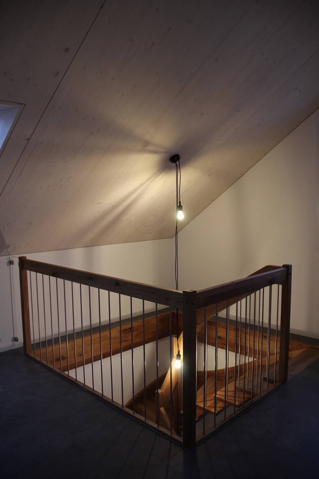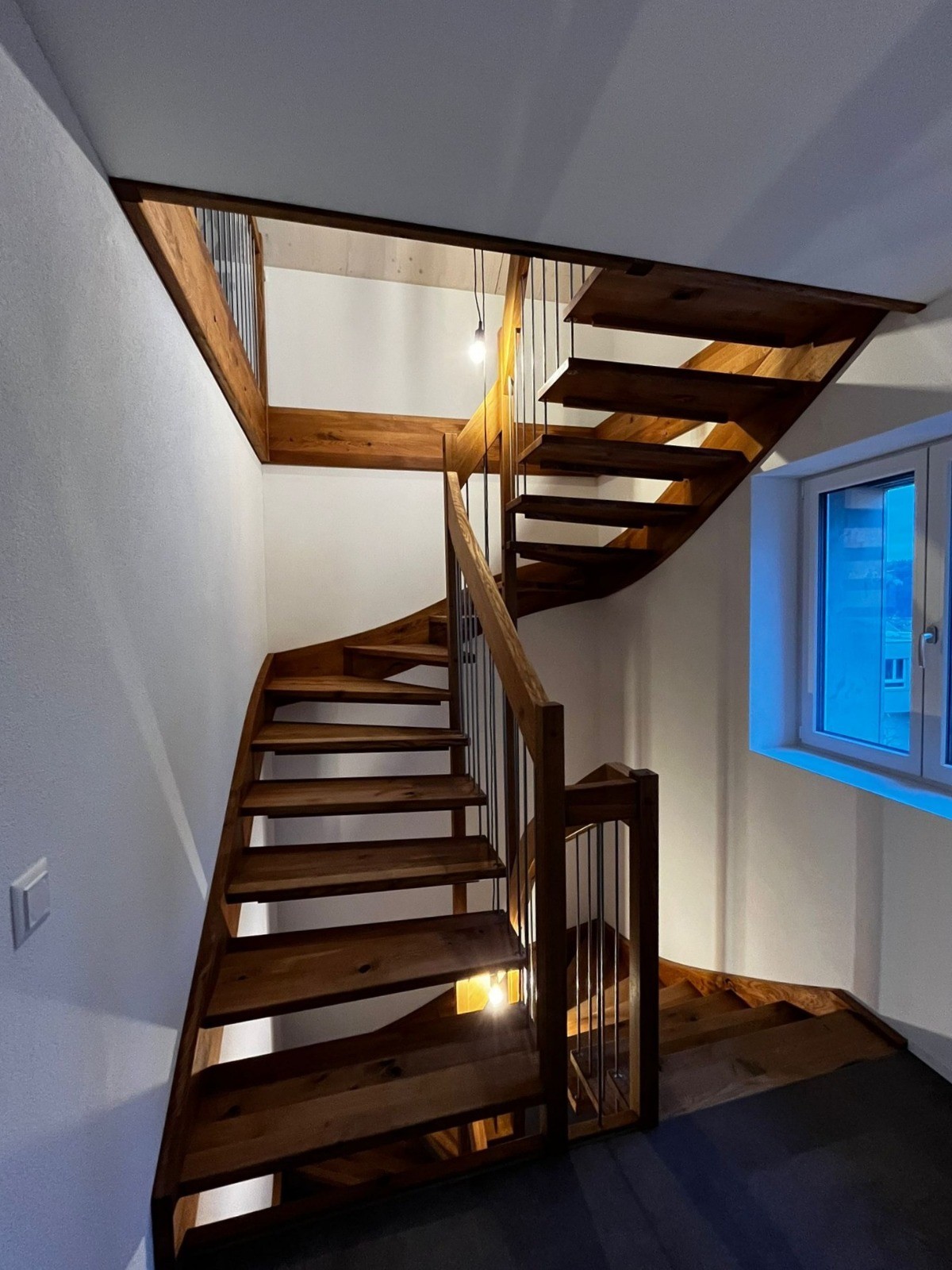 In einem Einfamilienhaus haben wir nebst einer Aufstockung und einer energetischen Sanierung auch ein neues Treppenhaus gemacht. Die Treppe reicht über drei Stockwerke und die Tritte wurden teils am Handlauf aufgehangen. Dadurch wirkt sie leichter und es kommt viel Licht hindurch. 😊💪🏻