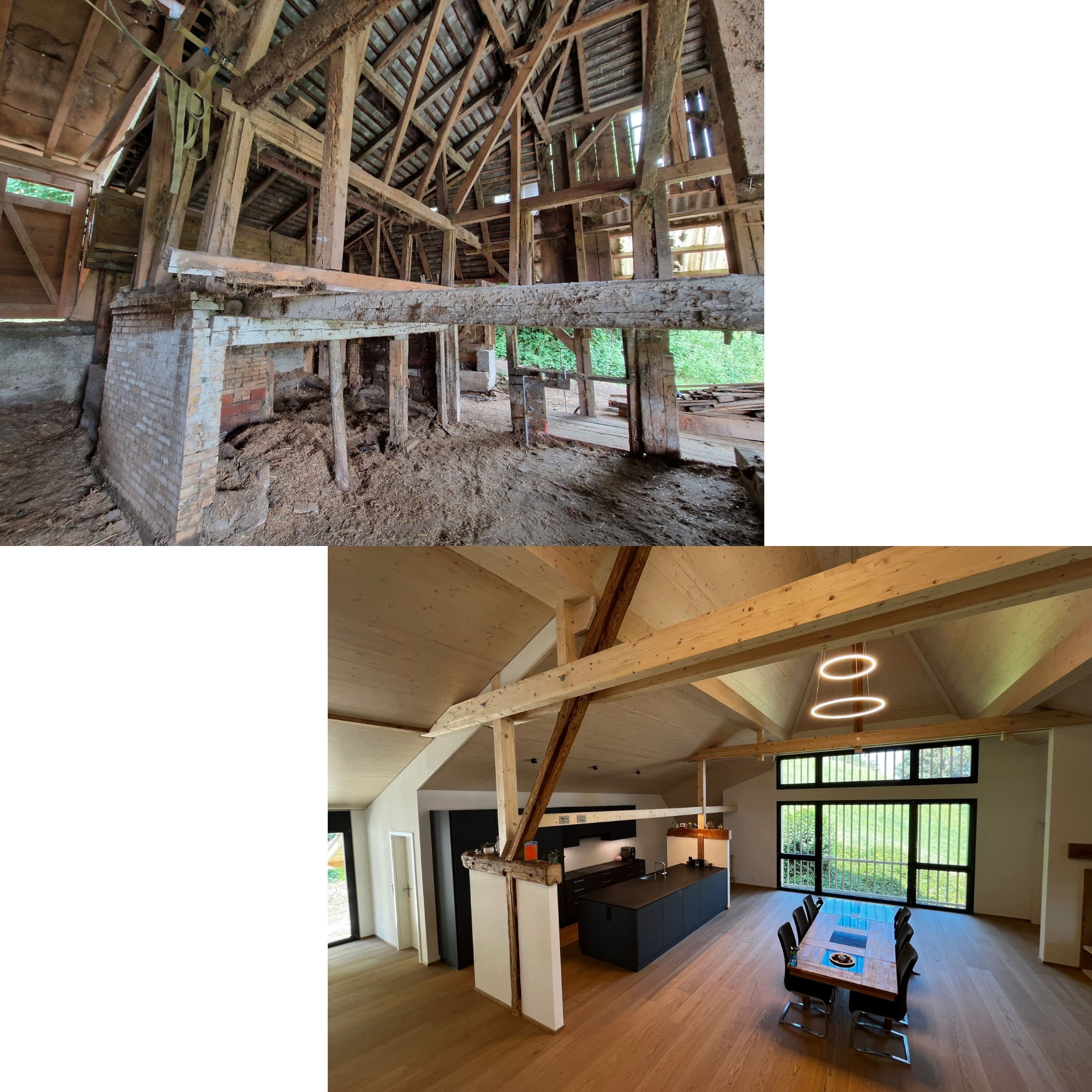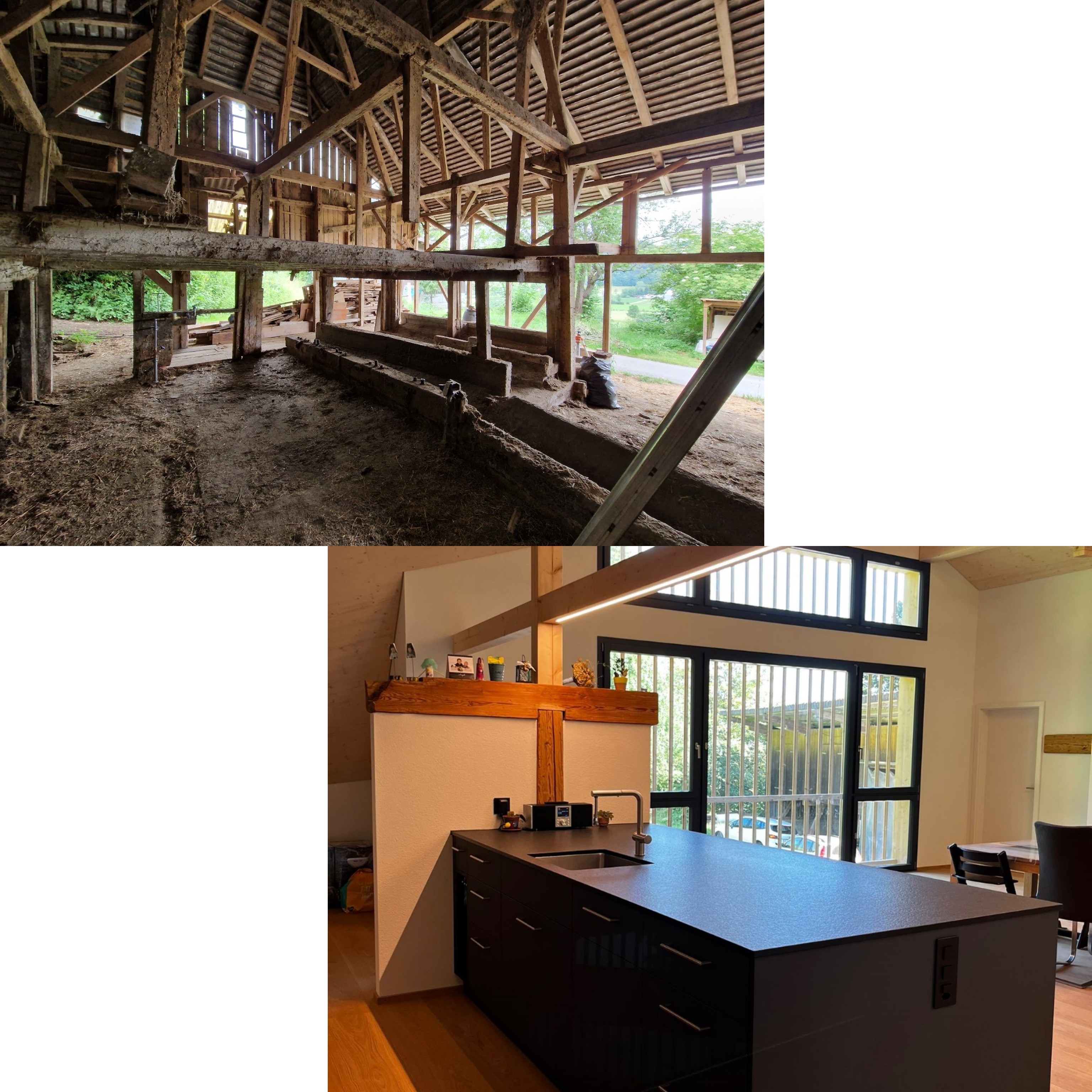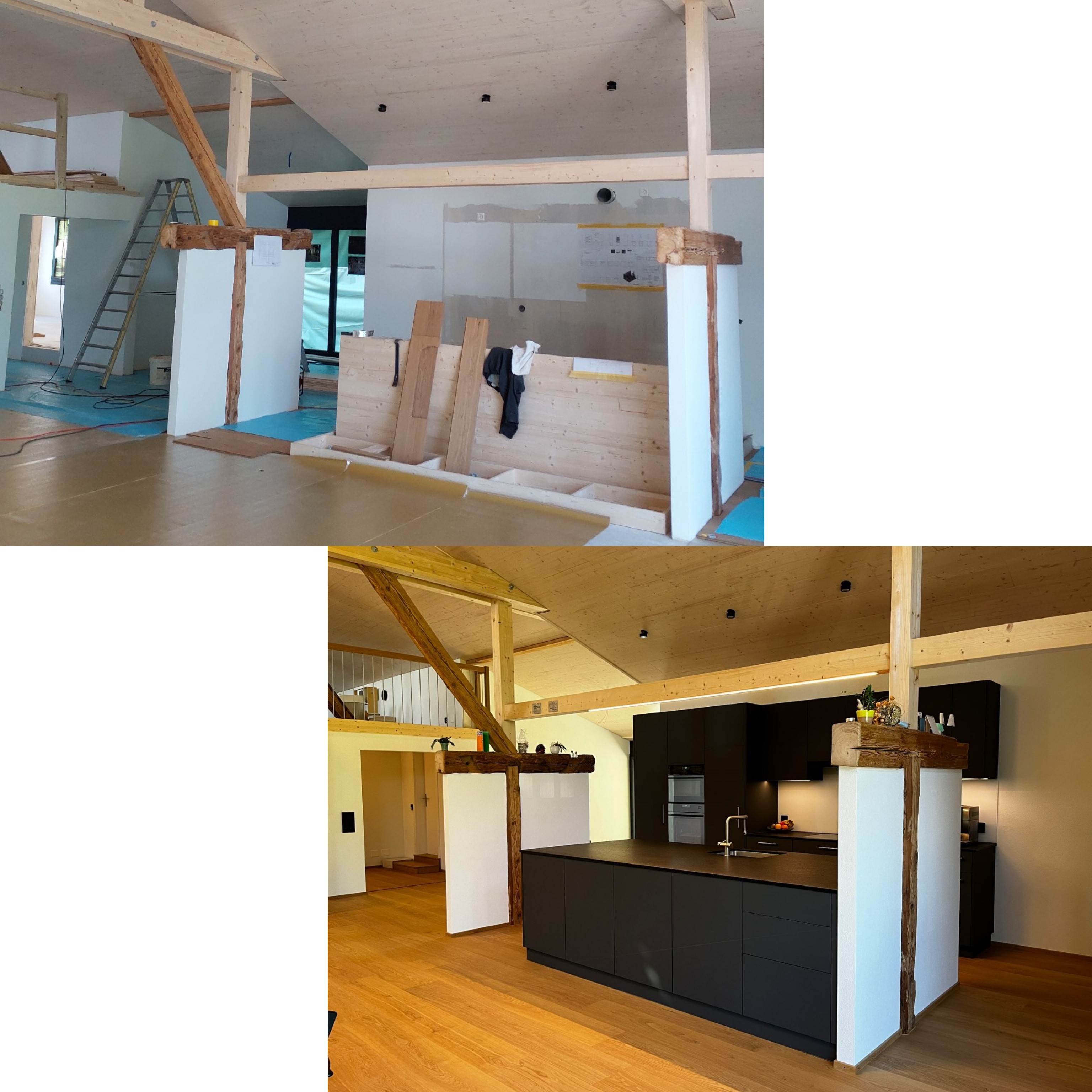 Die Gesamtsanierung eines Bauernhauses ist nach fast zwei Jahren (inklusive Planung) endlich fertig. Bei diesem schönen Projekt verrichteten wir alle Zimmer- und Schreinerarbeiten und waren auch für die Planung und die Bauleitung zuständig. Auf den vorher, nachher Bildern ist die grosse Veränderung deutlich sichtbar. P.s. direkt unter der heutigen Küche war früher der Stall. 🐮😎