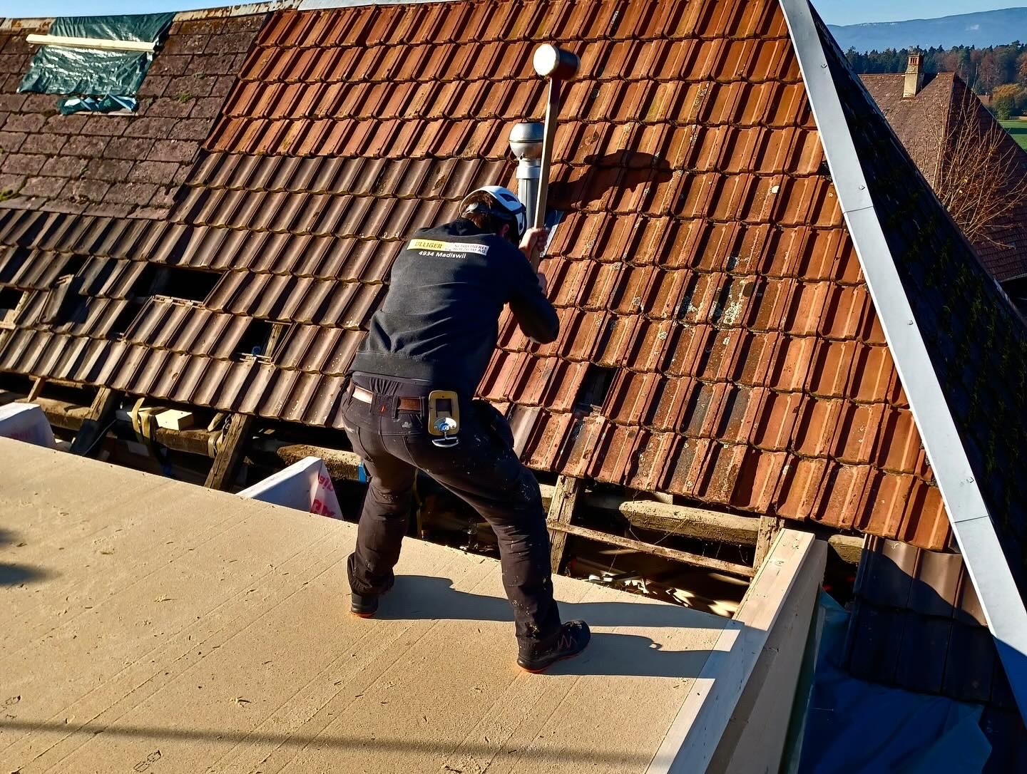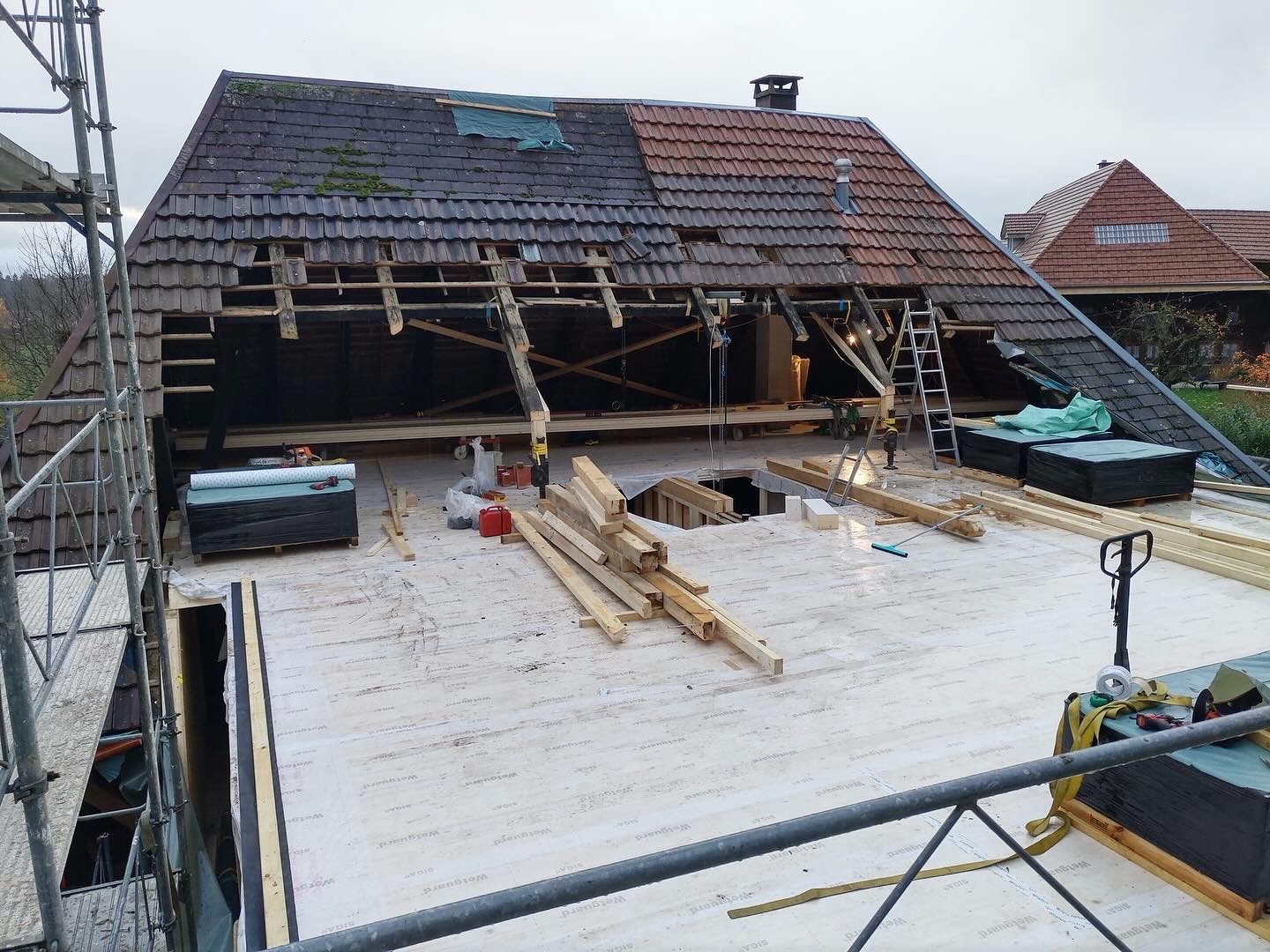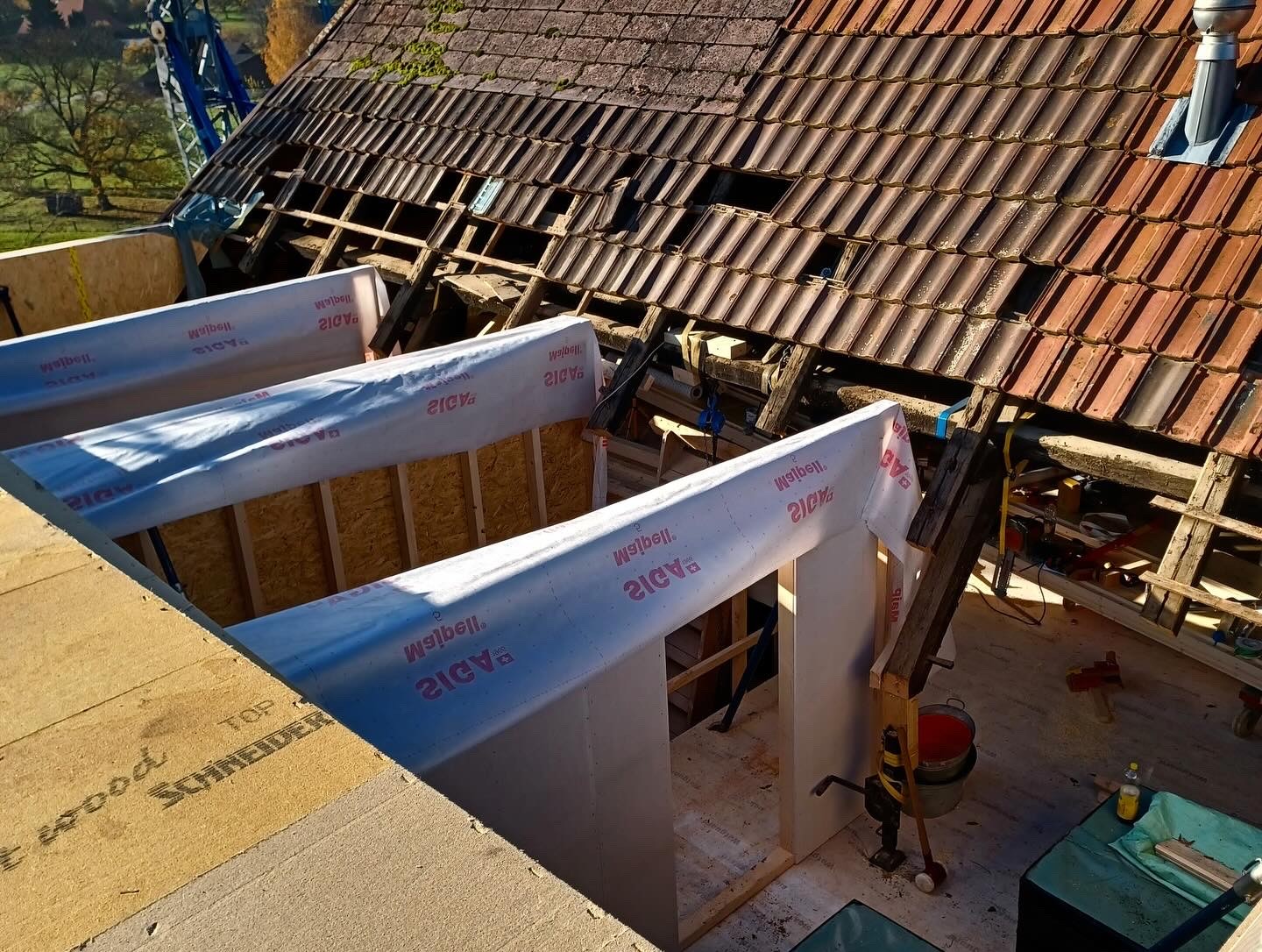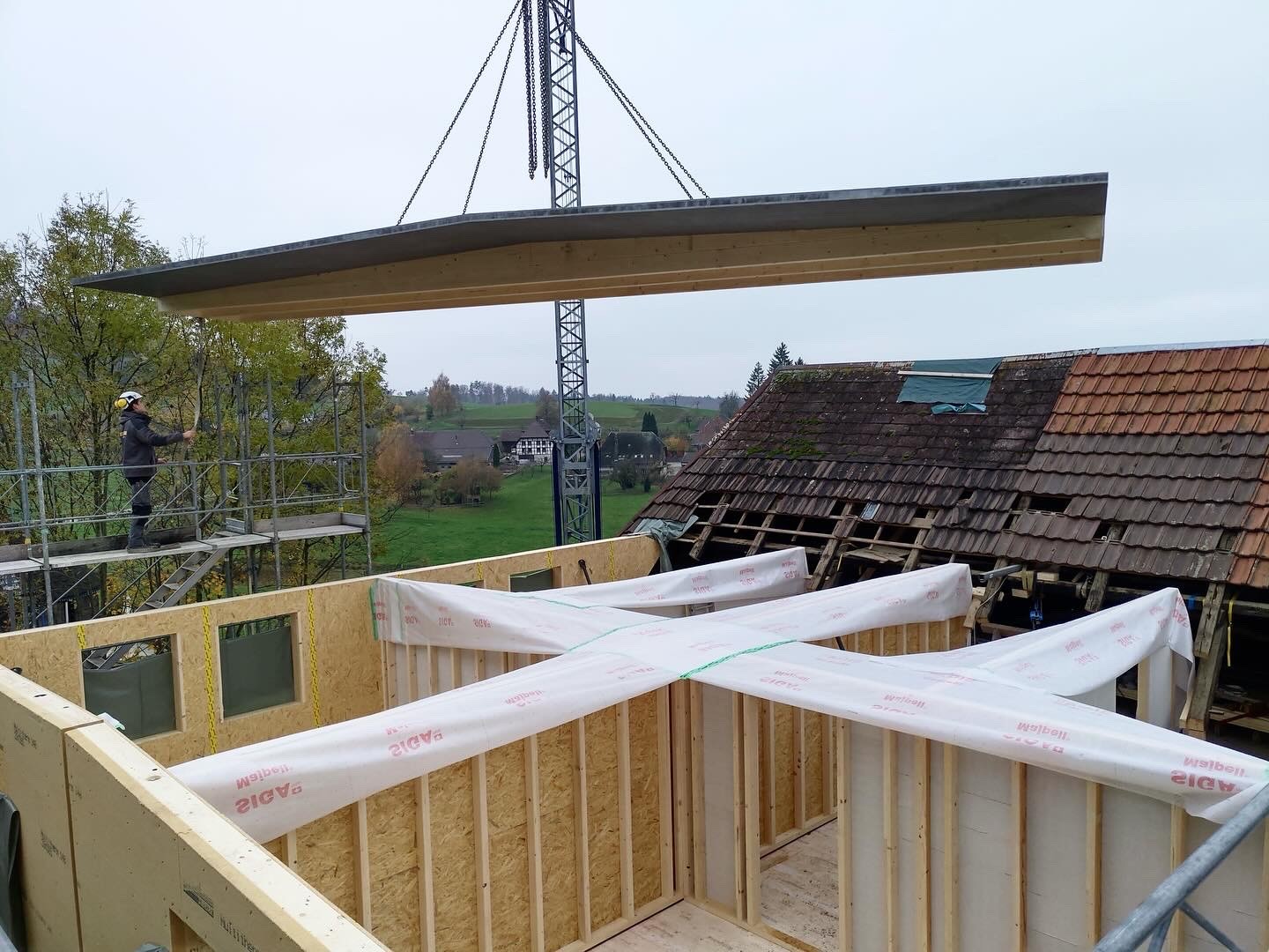 Unsere Zimmerleute richten hier einen Wohnanbau in Elementbauweise auf. Das Spezielle ist, dass der Anbau nicht nur an das bestehende Haus angebaut wird, sondern noch in dieses hinein läuft. (Siehe Bild nr. 7) 🏗️🏡💪🏻